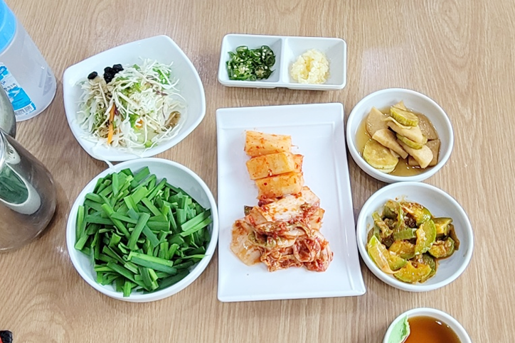 밑반찬이 세팅이 되었네요. 저는 배추김치와 피클이 넘 맛있었어요. 나중에 배추김치 더 가져다가 먹었습니다.