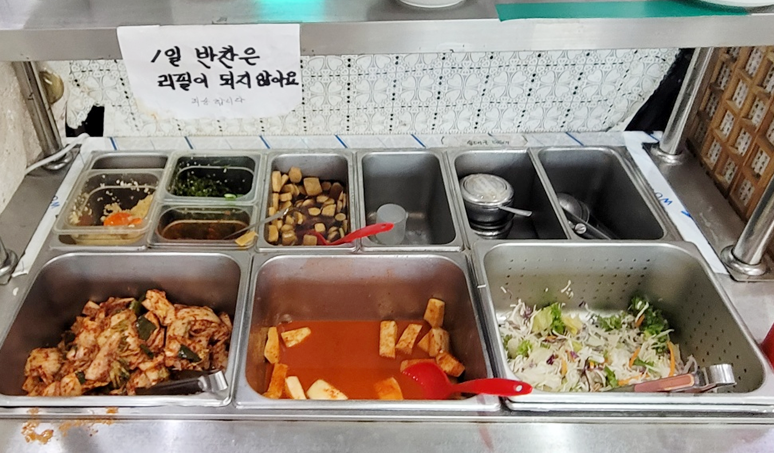 1일 반찬이 리필이 되지 않는다는 이야기는.... 그날그날 나오는 반찬은 리필 코너에 없어요. 이 날의 1일 반찬은 호박볶음이었어요.
