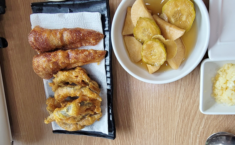 살짝 탄건가... 싶을정도로 색상이 진해서 처음에는 당황했는데요. 알고보니 반죽의 색상이 원래부터 노란색. 그래서 튀김 색상이 더 진해요. 이 집 튀김 맛집입니다. 정말 바삭바삭하니 맛있어요.