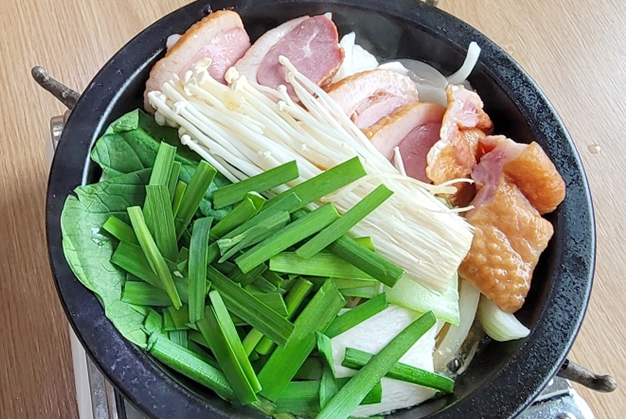 그냥 야채와 훈제오리 몇점이 있는것 같은데요. 맛을 보면 놀랍니다. 육수가 맛있는건지, 아니면 훈제오리에서 맛있는 성분이 나온건지.... 아무튼 야채가 익어가면서 정말 맛있어져요. 밑에 깔린 양파도 너무 맛있고 팽이버섯도 너무 맛있어서 놀랐어요.