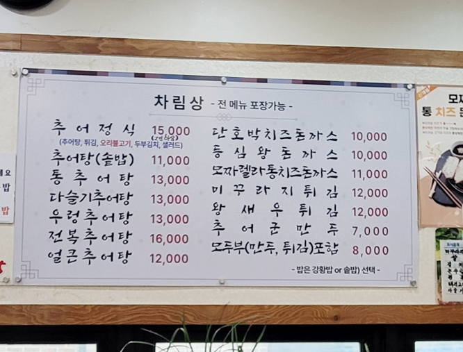 차림표를 보면 추어탕 전문점답게 여러가지 추어탕이 보입니다. 그리고 추어탕을 못드시는 분들이나 아이들을 위해서 돈까스도 주문이 가능하구요. 미꾸라지 튀김이나 왕새우 튀김도 있어요.