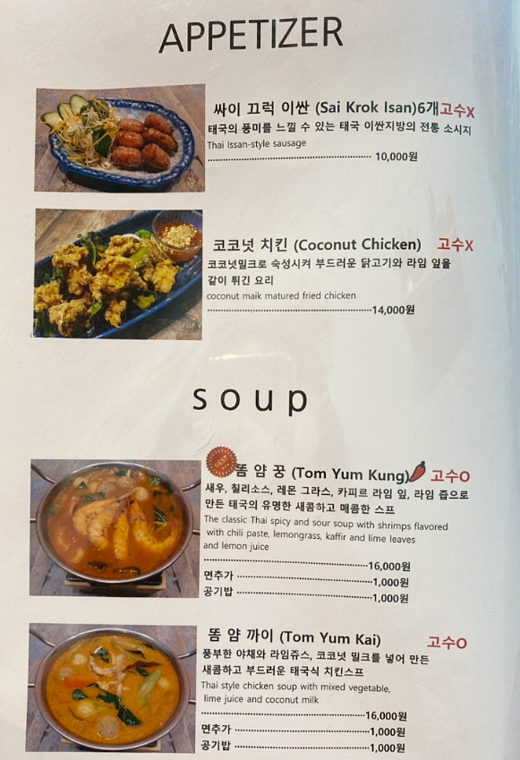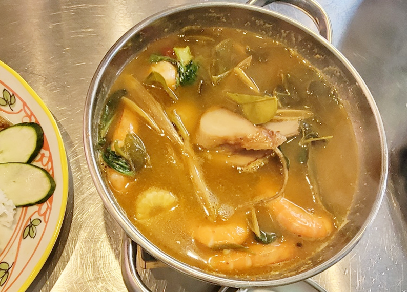 똠양꿍은 태국을 대표하는 스프인데, 많은 분들이 좋아하죠. 매콤한 국물이 매력적인데요. 시큼한 맛이 나는 이유는 레몬즙을 넣기 때문이라고 해요. 국이나 찌게에서 시큼한 맛이? 라고 생각할 수 있겠지만, 사실 우리나라의 김치찌게도 매콤하면서도 익은 김치의 시큼한 맛이 납니다. 똠양꿍은 해산물에 레몬즙, 레몬그라스, 고수, 생강 등의 향신료가 많이 들어가서 처음에는 낯설게 느끼신는 분들도 계시지만, 먹다보면 그 매력이 느껴집니다.