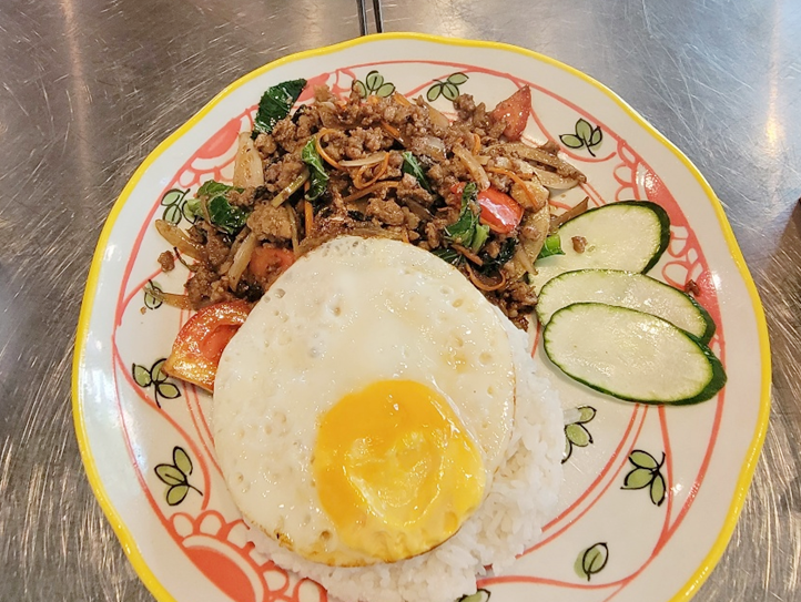 '무 쌉 랏 카우'입니다. 그림만 보고 주문을 했기 때문에 여러번 먹었었는데도, 이렇게 이름이 어려운줄 몰랐습니다. 저희집 식구들은 고기볶음밥이라고 불러요. 고기볶음이 짭짤해서 밥에 섞어먹으면 딱 좋아서, 우리집 딸래미가 좋아하는 메뉴입니다. 가격은 9000원입니다.