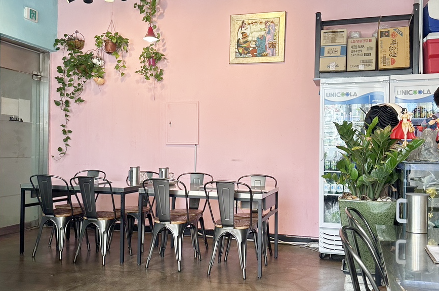 딸기우유 색상의 벽이 예쁘네요. 식물과도 잘 어울려요.