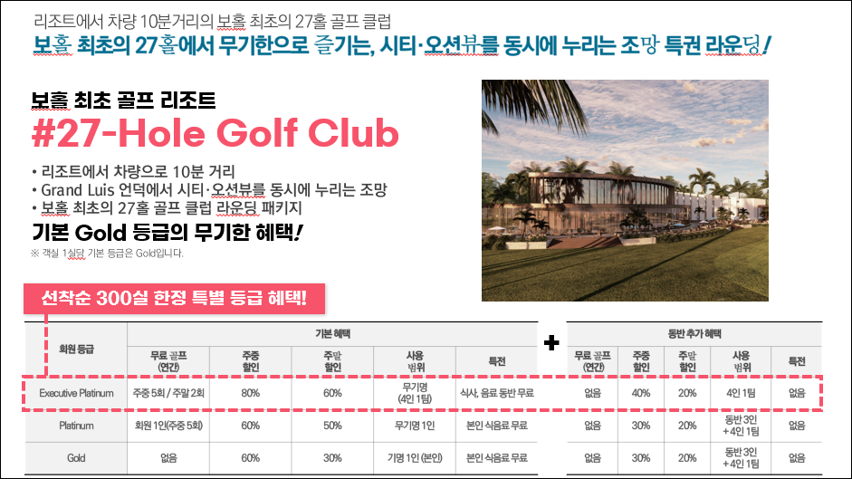 제이파크 세부 VVIP 프리미엄 여행 뿐만아니라, 보홀 최초 오션뷰 27홀 골프장 회원권, 스파, 레스토랑, 바, 픽업서비스, 키즈 서비스, 실버 케어 서비스 등 여러 혜택을 제공합니다.
