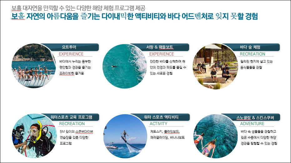 엘 카스카디 제이파크 보홀은 영국 명문대와 연계한 영어 교육과 승마, 스킨 스쿠버 자격 인증 프로그램, 골프 교육 등 여러 다양한 교육 프로그램을 운영할 계획입니다.