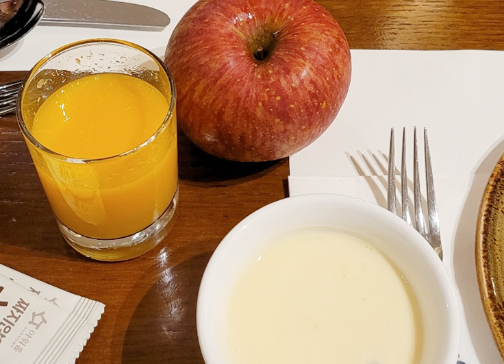 제주신화월드 조식뷔페에는 과일이 통으로 진열해 놓은 곳이 있어요. 사과나 바나나, 귤이 통째로 쌓여 있어서 가져다가 먹으면 되요. 사과가 생각보다 맛있어요. 아침에 사과는 금이라는데, 이렇게 통째로 먹으니 더 건강해지는 느낌이네요.
