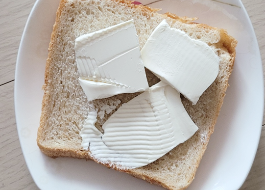 식빵 한쪽에 크림치즈를 아낌없이 올렸습니다.