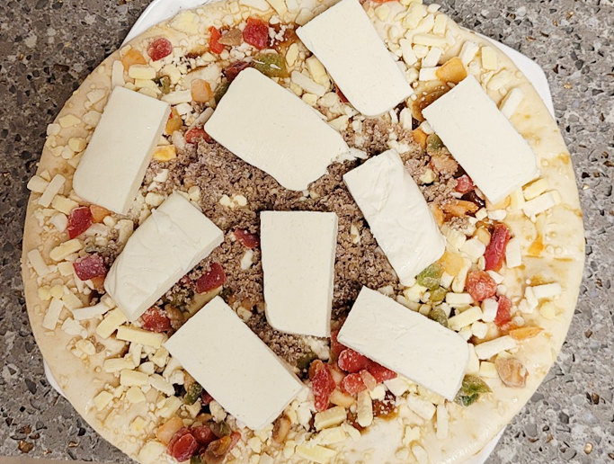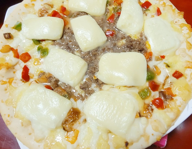 이 날은 치즈를 좀 많이 올렸네요. 보통은 뿌리는 모짜렐라 치즈를 오리는데요. 이 날은 덩어리 피자를 올렸어요. 이 덩어리 피자는 녹으면서 완전히 쭉쭉 늘어나고 맛있는 치즈가 되었습니다. 완전히 맛을 풍부하게 해주었어요.