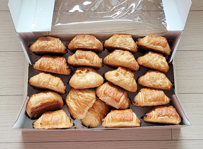 뚜껑을 열어보니, 20개의 미니 뺑오쇼콜라가 들어있습니다. 오밀조밀 들어있는 빵을 보니 기분이 좋아지네요.