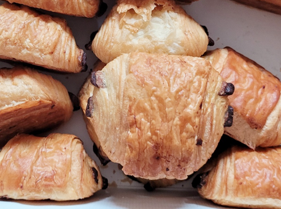 뺑오쇼콜라는 초콜릿이 들어있는데요. 일반 초코빵처럼 초코를 많이 넣지 않아요. 그리고 초코크림이라기보다는 초코 자체를 소량 넣습니다. 보통 초코빵이 초코맛으로 먹는다면, 뺑오쇼콜라는 크루아상의 느낌을 즐기다가, 마지막에 심심하지 않게 달콤하면서도 진한 초코로 마무리하는 느낌입니다.