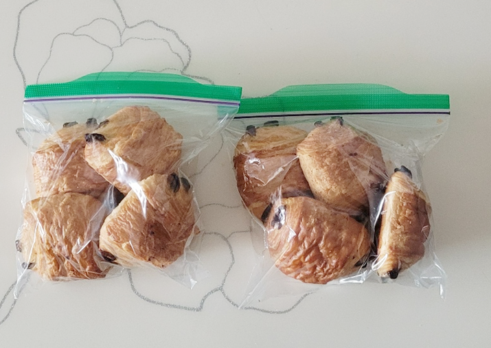 이중 지퍼팩이지만, 저렇게 소포장한 후에 큰 비닐로 한번더 넣어주면, 끝까지 버터향 가득한 맛있는 뺑오쇼콜라를 즐길 수 있어요.