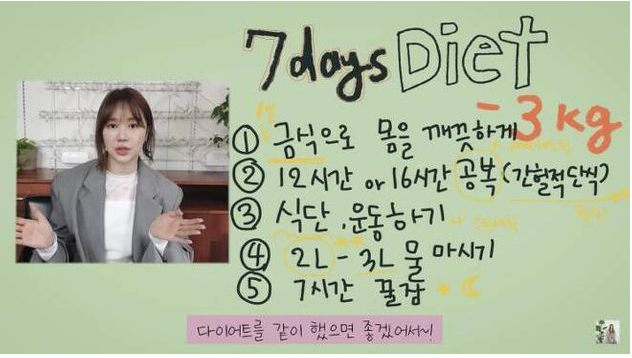 첫 번째, 간헐적 단식 시간을 정하는 것입니다. ① 16시간 공복 :8시간 식사 ② 12시간 공복 :12시간 식사 둘 중 하나를 선택하면 된다. 윤은혜는 ①번을 택했습니다.