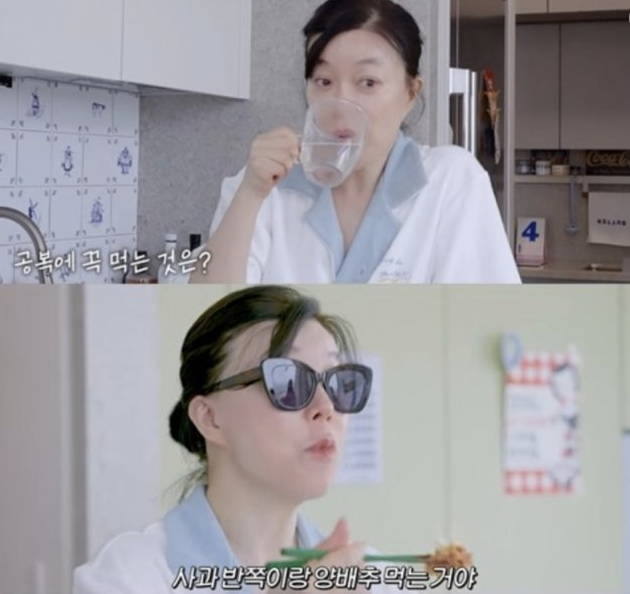 최화정은 "아침 공복에 꼭 먹는다"며 식초를 탄 따뜻한 물을 마신 뒤 양배추와 사과 반 조각을 갈아 샐러드를 만들어 먹었습니다. 이어서 여성 호르몬제, 비타민C, 오메가, 칼슘 등 영양제를 먹었습니다.