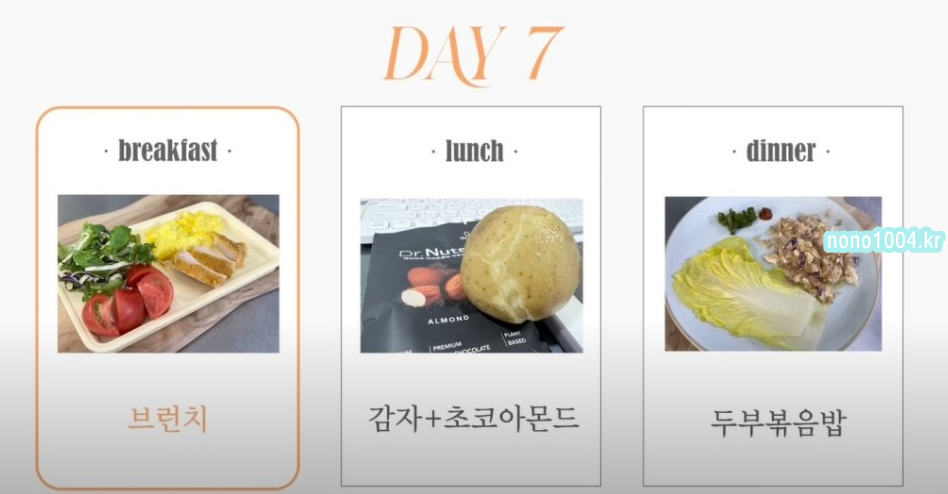 일곱번째 날에는 브런치, 감자+초코아몬드, 두부볶음밥입니다.