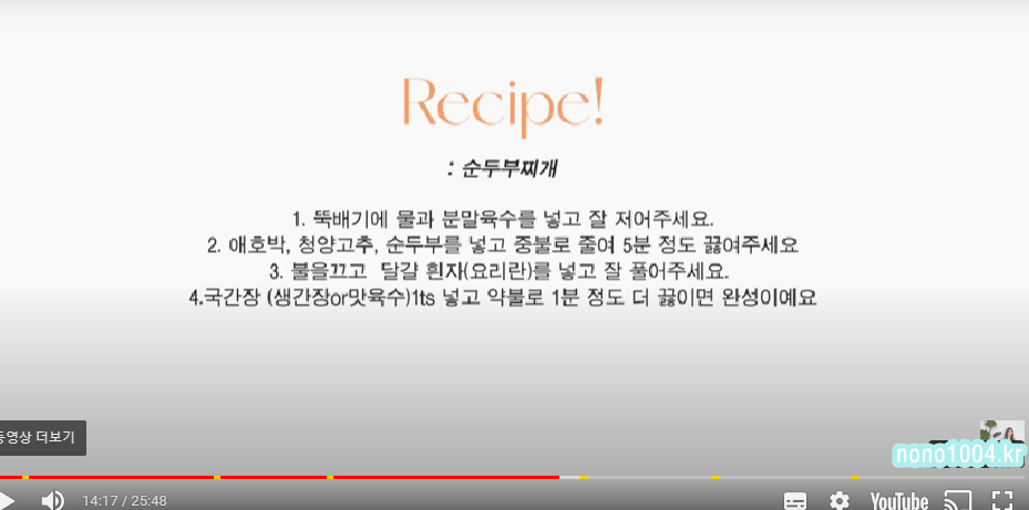보통 우리가 생각하는 순두부찌개는 빨간색인데요. 윤은혜의 다이어트 식단에 들어있는 순두부찌개는 맑은 국이에요. 간은 국간장을 1티스푼만 넣어주기 때문에 담백한 맛일것 같습니다. 다이어트에 좋을 수 밖에 없는 찌개입니다.
