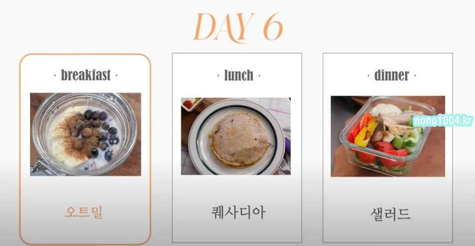 여섯번째 날에는 오트밀, 퀘사디아, 샐러드입니다.