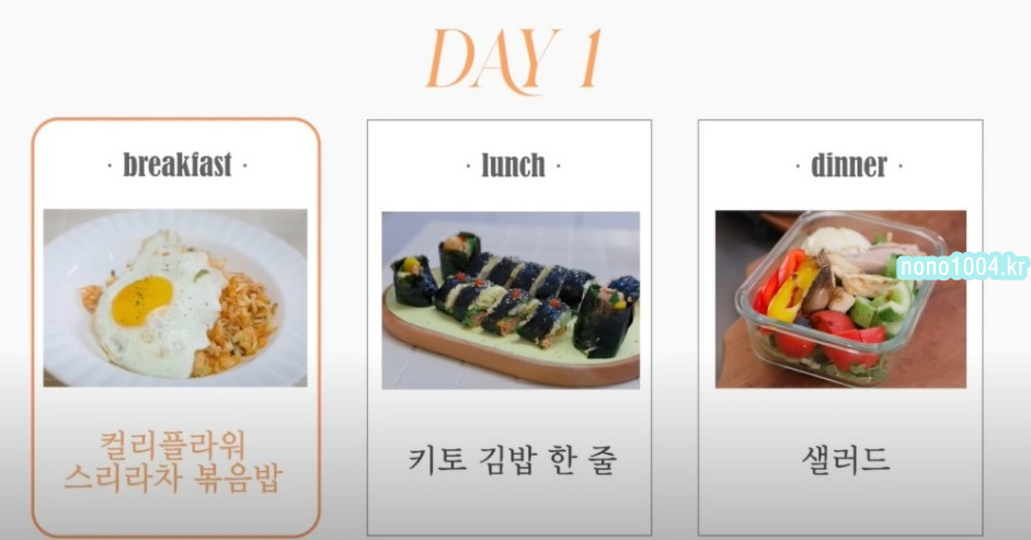 첫째날에는 컬리플라워 스리리차 볶음밥과 키토 김밥 한줄, 저녁은 샐러드입니다.