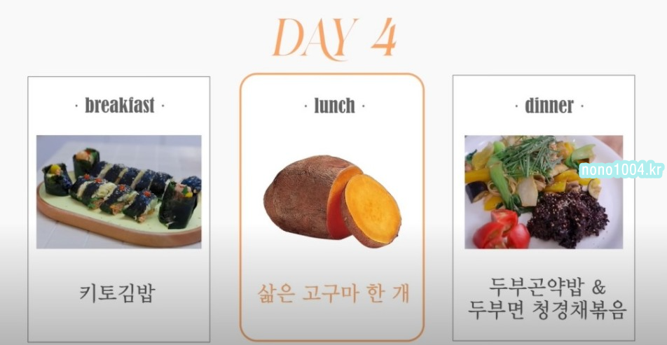 네번째날에는 키토김밥, 삶은 고구마 한개, 두부 곤약밥과 두부면 청경채 볶음을 먹습니다.