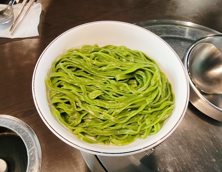 최가네 면은 초록색입니다. 색상이 이래서 더 건강하게 느껴지는데요. 솔직히 시금치의 녹색인지, 녹차나 브로컬리의 녹색일지 모르겠습니다~^^;;
