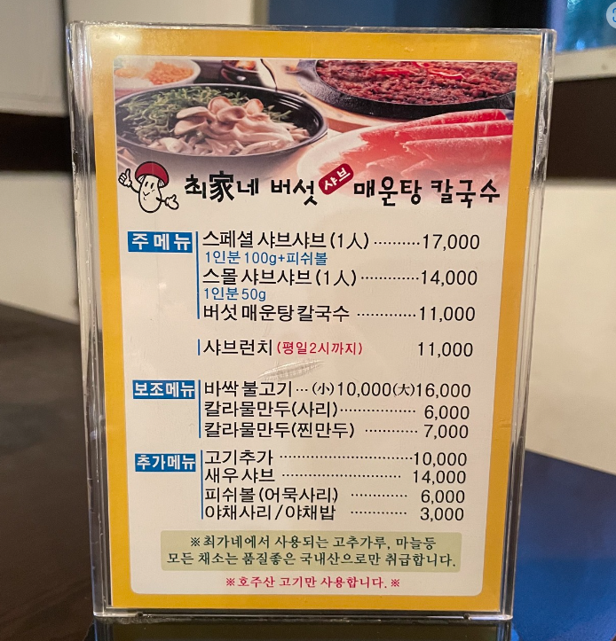 <최가네 버섯 샤브 매운탕 칼국수> 가격표입니다.