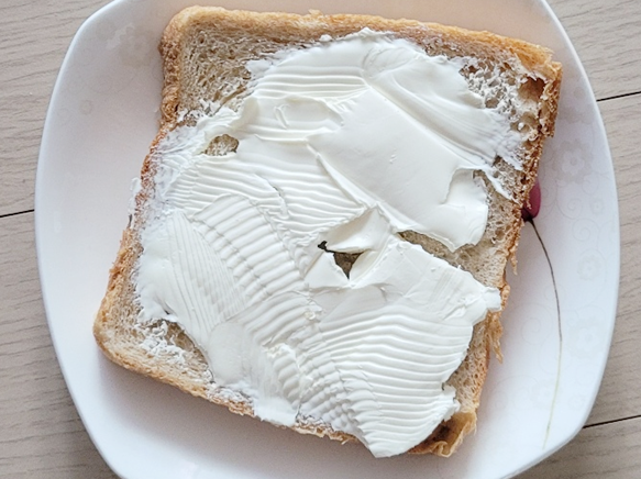 식빵 한쪽에 크림치즈를 아낌없이 올렸습니다.