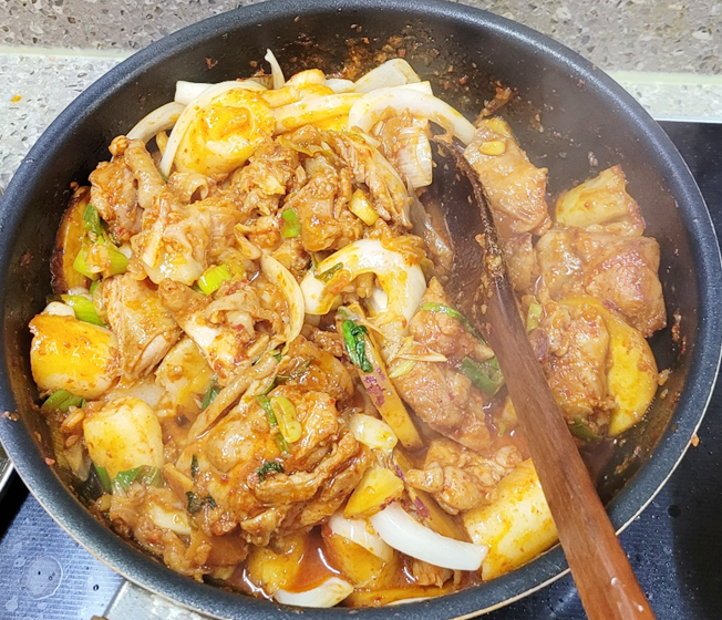 양념된 통큰닭갈비에 양파, 고구마, 떡, 양배추까지 넣었습니다.