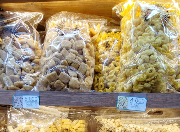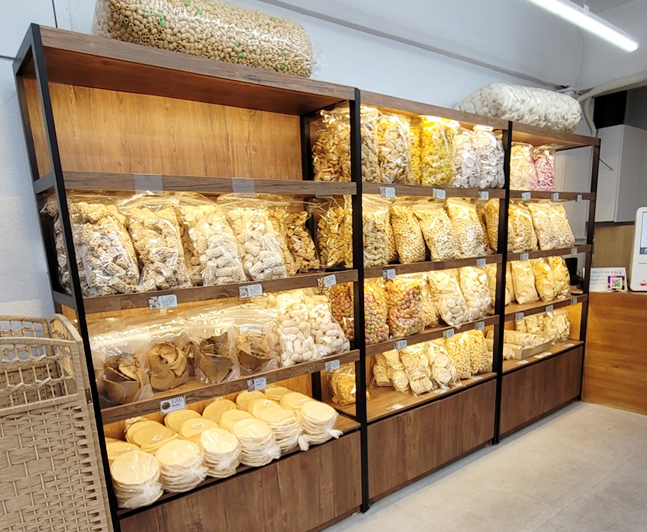 가게는 규모가 작지만, 들어서면 아주 아기자기하게 맛있는 뻥튀기와 옛날과자들이 진열되어 있어요.