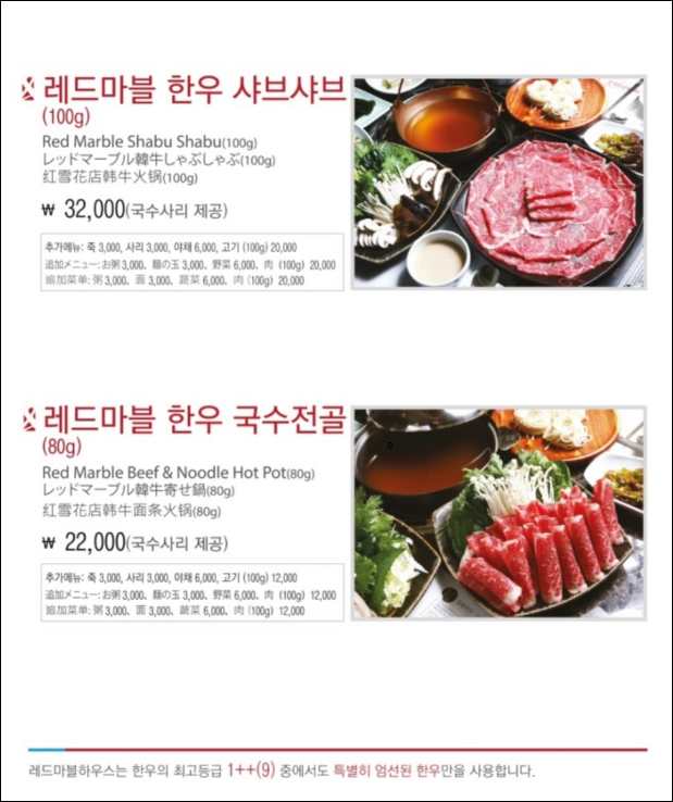 레드마블 한우 국수전골이 1인분에 22000원입니다. 가격은 저렴하지는 않지만, 맛있는 한우가 들어가는 고기국수라서 기대가 됩니다.