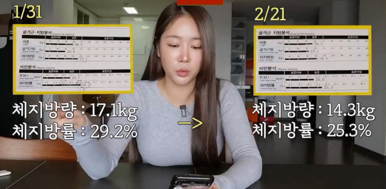 소유의 인생 최대 몸무게 62.4kg이 됐다고 밝혔었는데요. 1월 31일 체중 58.5kg, 체지방량 17.1kg, 체지방률 29.2%, 지난달 21일 체중 56.5kg, 체지방량 14.3kg, 체지방률 25.3%를 기록했습니다. 현재는 56kg보다 더 빠진 상태로 스트레스 없이 건강하게 감량했음을 알리며, 그 비법을 대공개 했습니다.